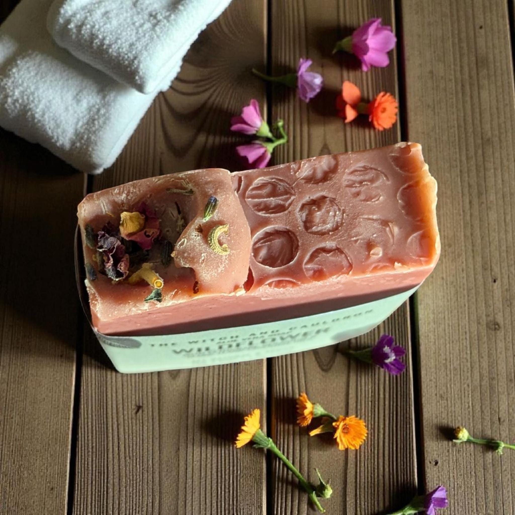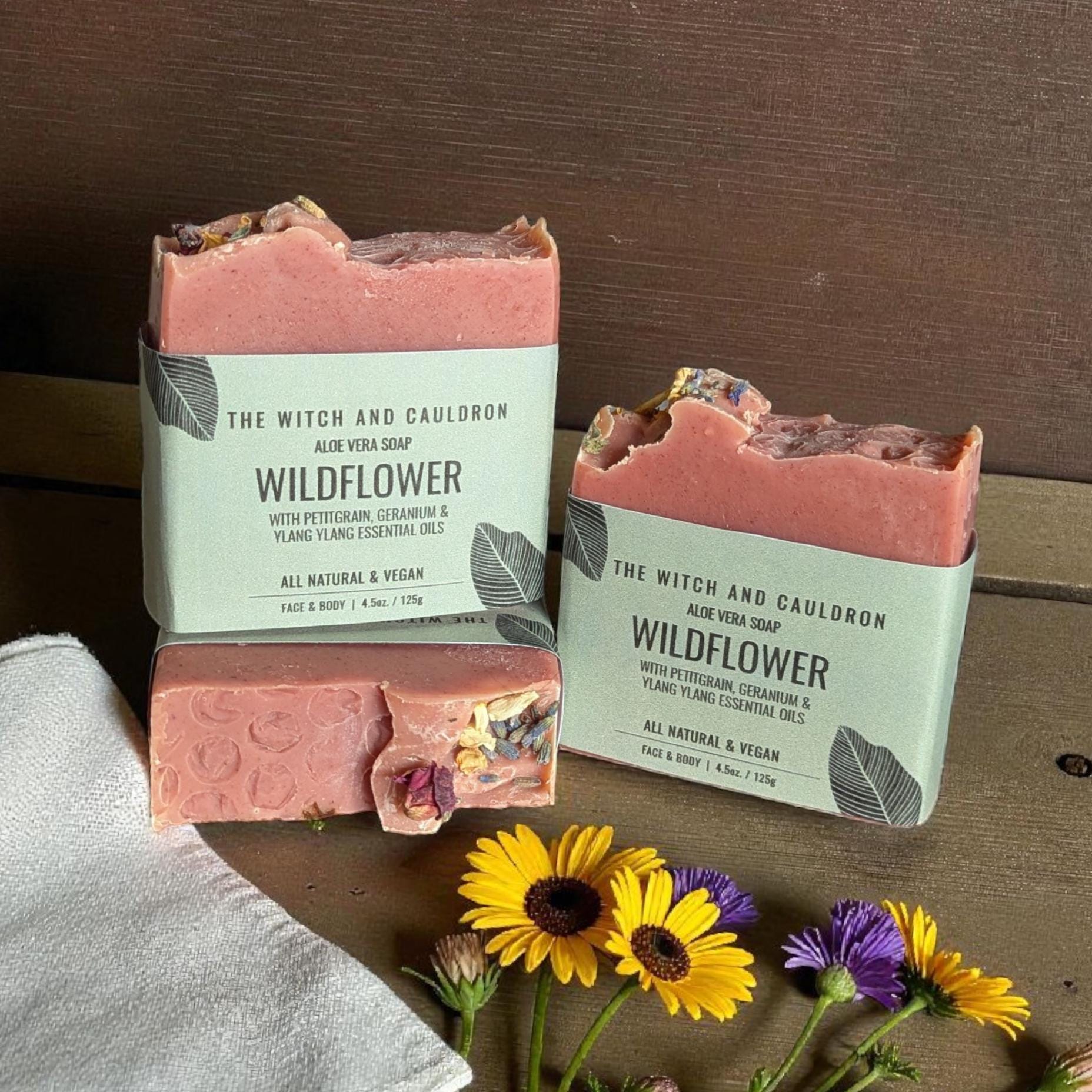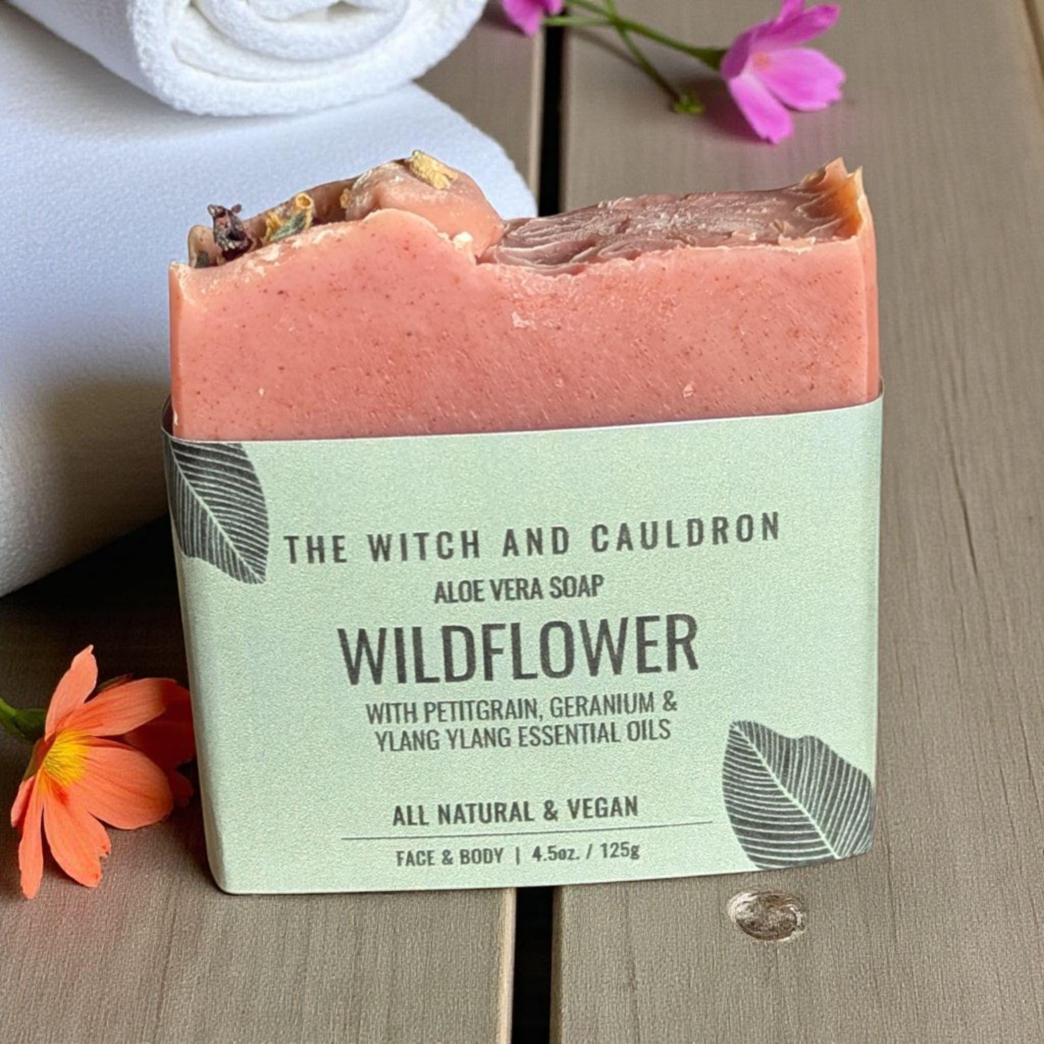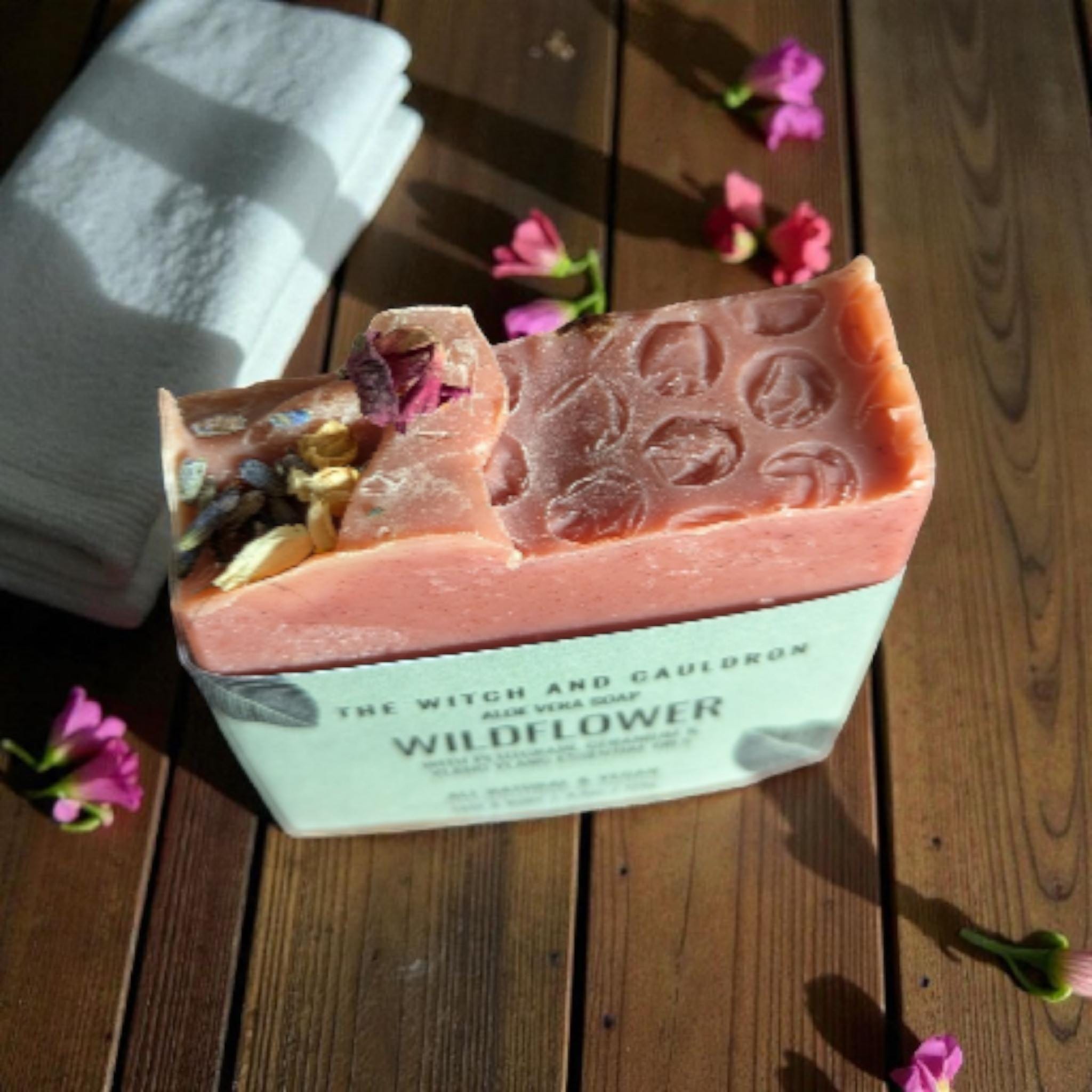 This Wildflower cold process soap is 100% natural, vegan, and palm-oil free. Made with a base of Aloe Vera Juice and wonderful skin-loving oils and butters, like Coconut Oil and Cocoa Butter. This gentle bar is naturally coloured with Madder Root Powder.