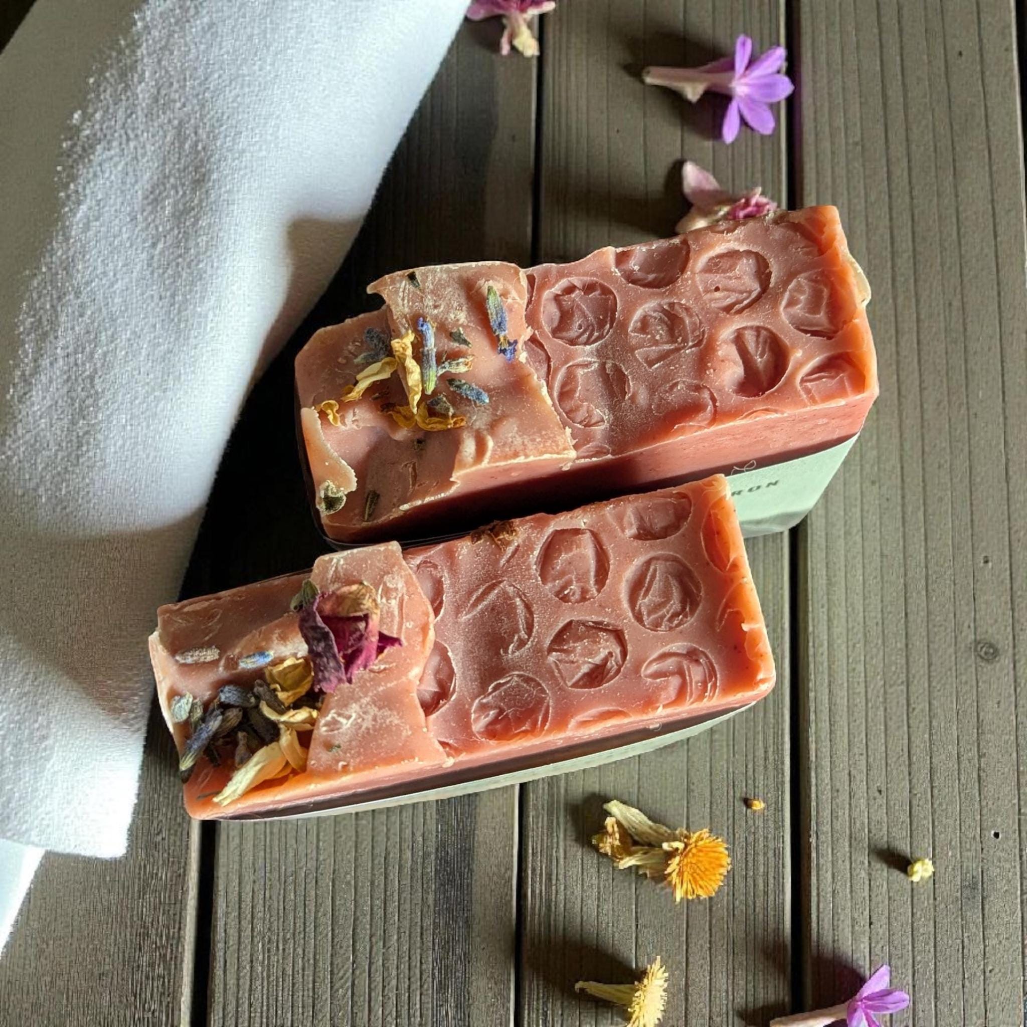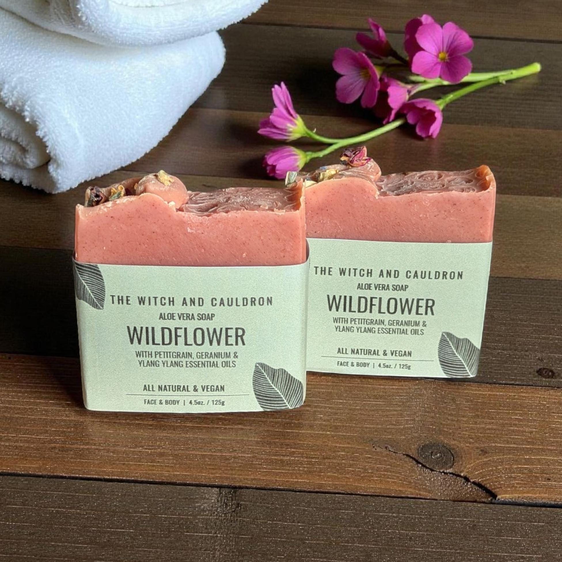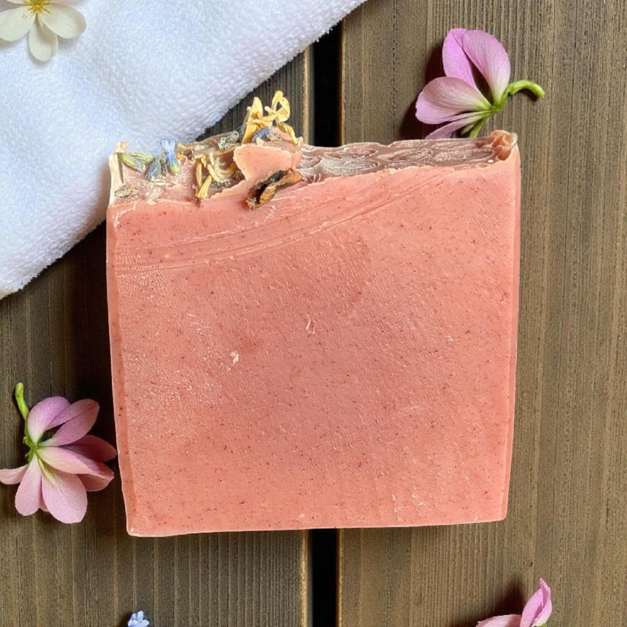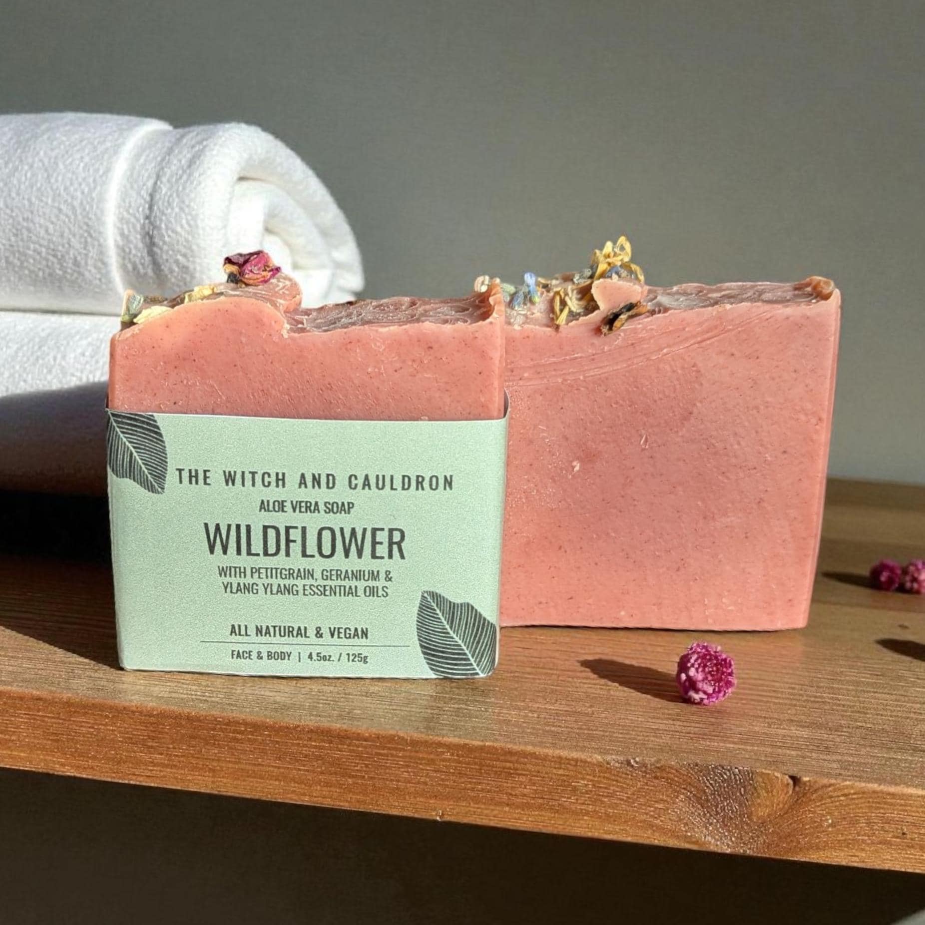 This Wildflower cold process soap is 100% natural, vegan, and palm-oil free. Made with a base of Aloe Vera Juice and wonderful skin-loving oils and butters, like Coconut Oil and Cocoa Butter. This gentle bar is naturally coloured with Madder Root Powder.