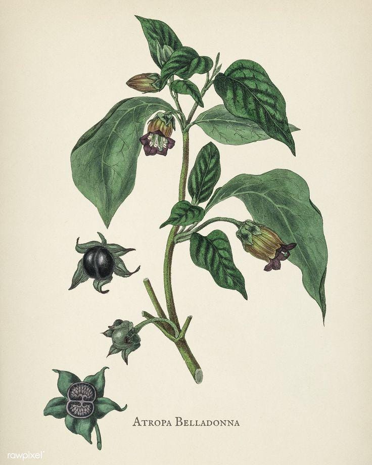 Belladonna or deadly nightshade, is a highly toxic, perennial herbaceous plant in the potato family. All parts are poisonous, containing compounds like atropine, which can cause severe illness or death.