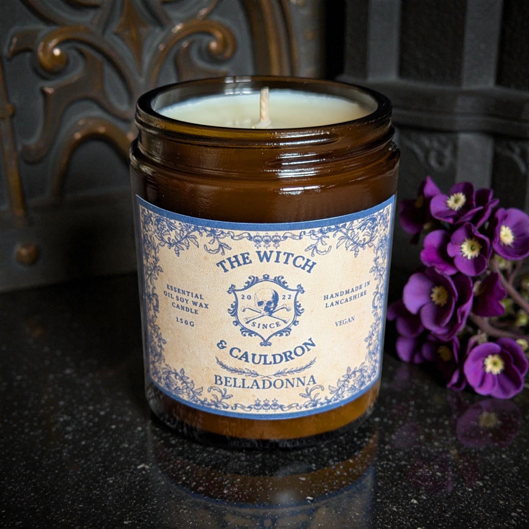 My Belladonna Soy Wax Candle has a dark, sweet, and herbal blend of Jasmine, Lavender, Vetiver, Patchouli and Cedarwood essential oils to evoke a mysterious, floral, and woody scent associated with this beautiful but toxic plant.