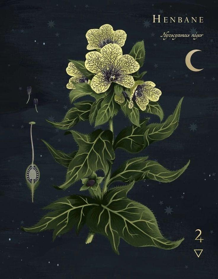 Known as the ‘witches’ plant’, henbane had great importance during the Middle Ages, being used by magicians and healers in ritual purifications by smoke as well as in the preparation of concoctions, love potions and ‘flying ointments.’