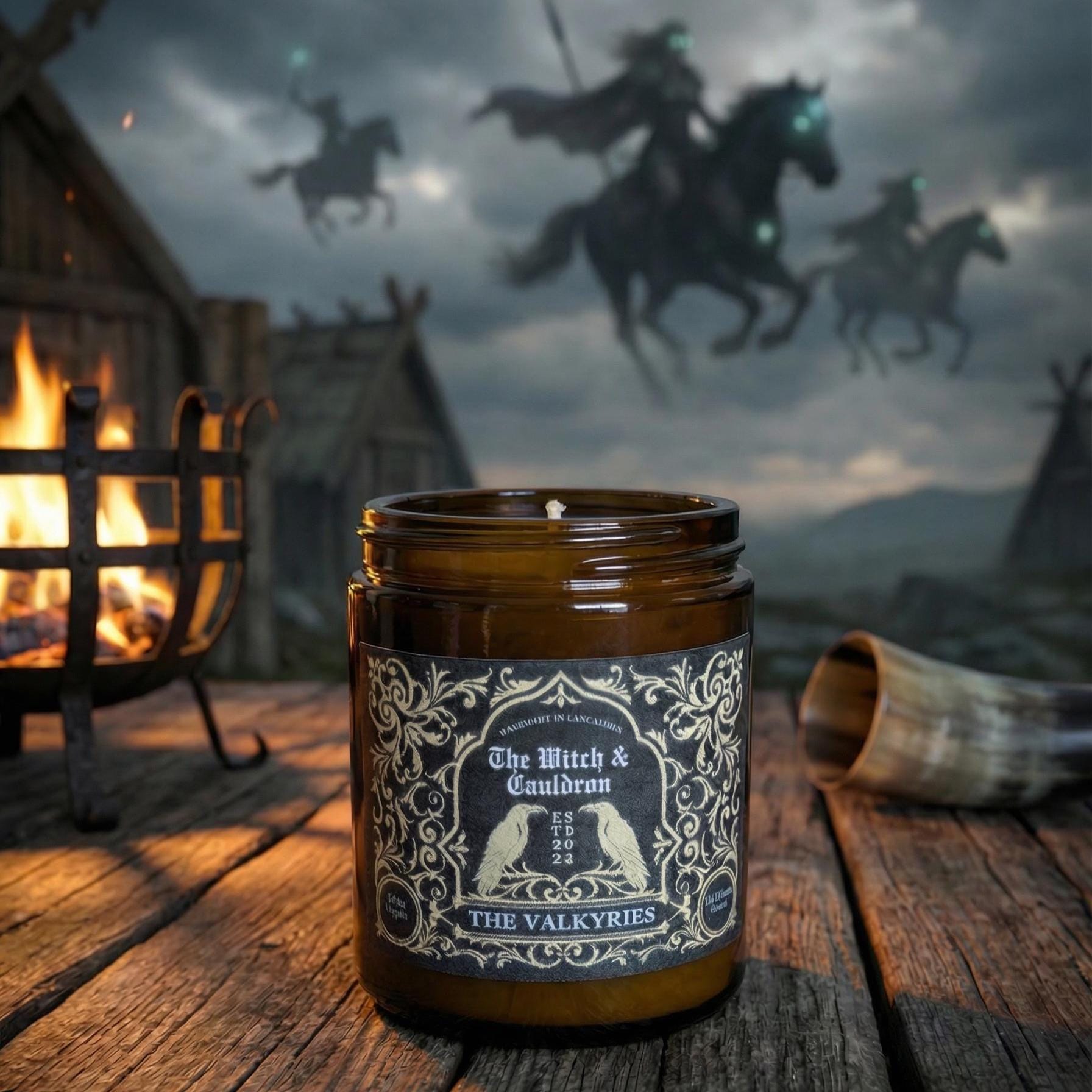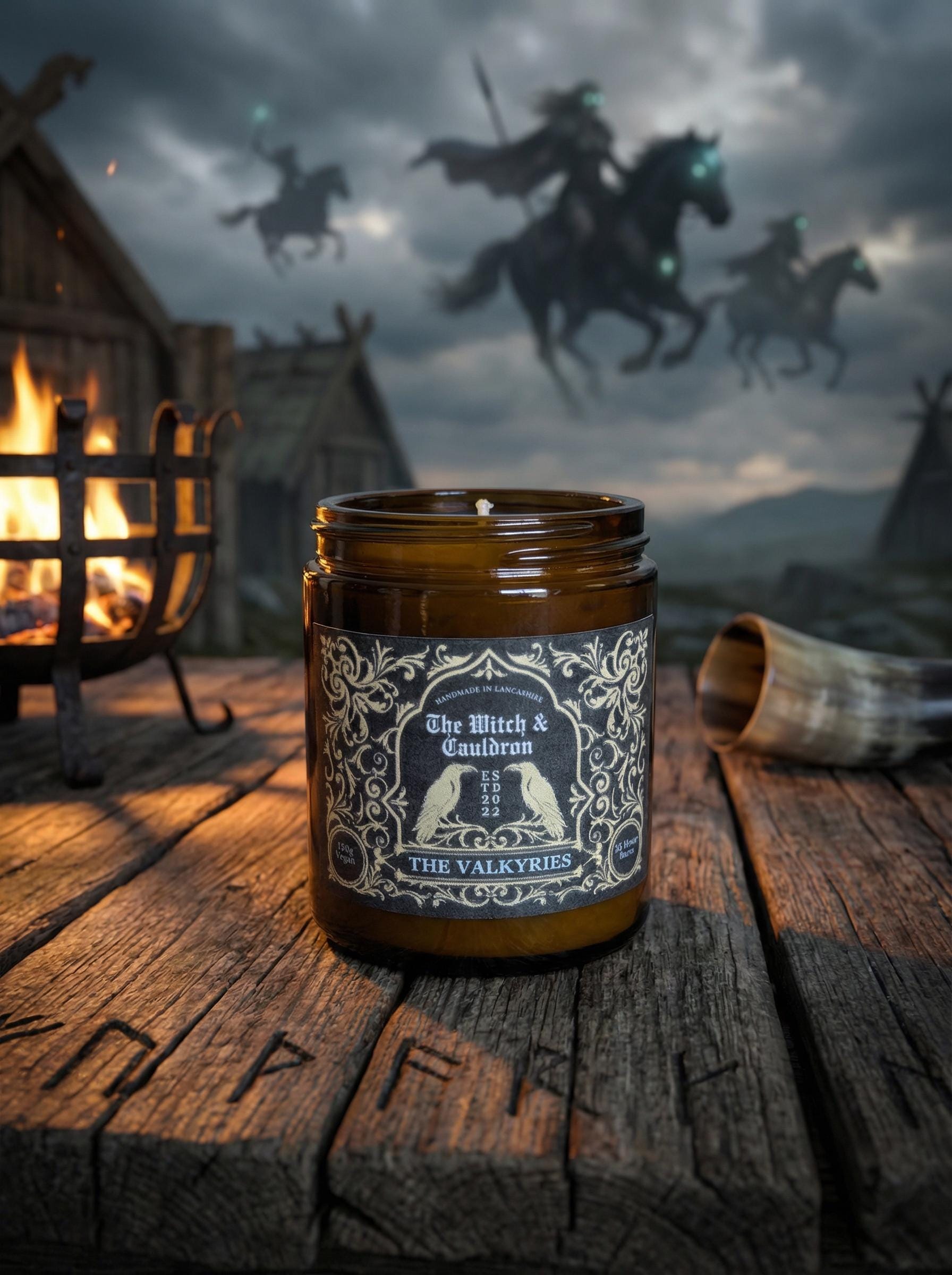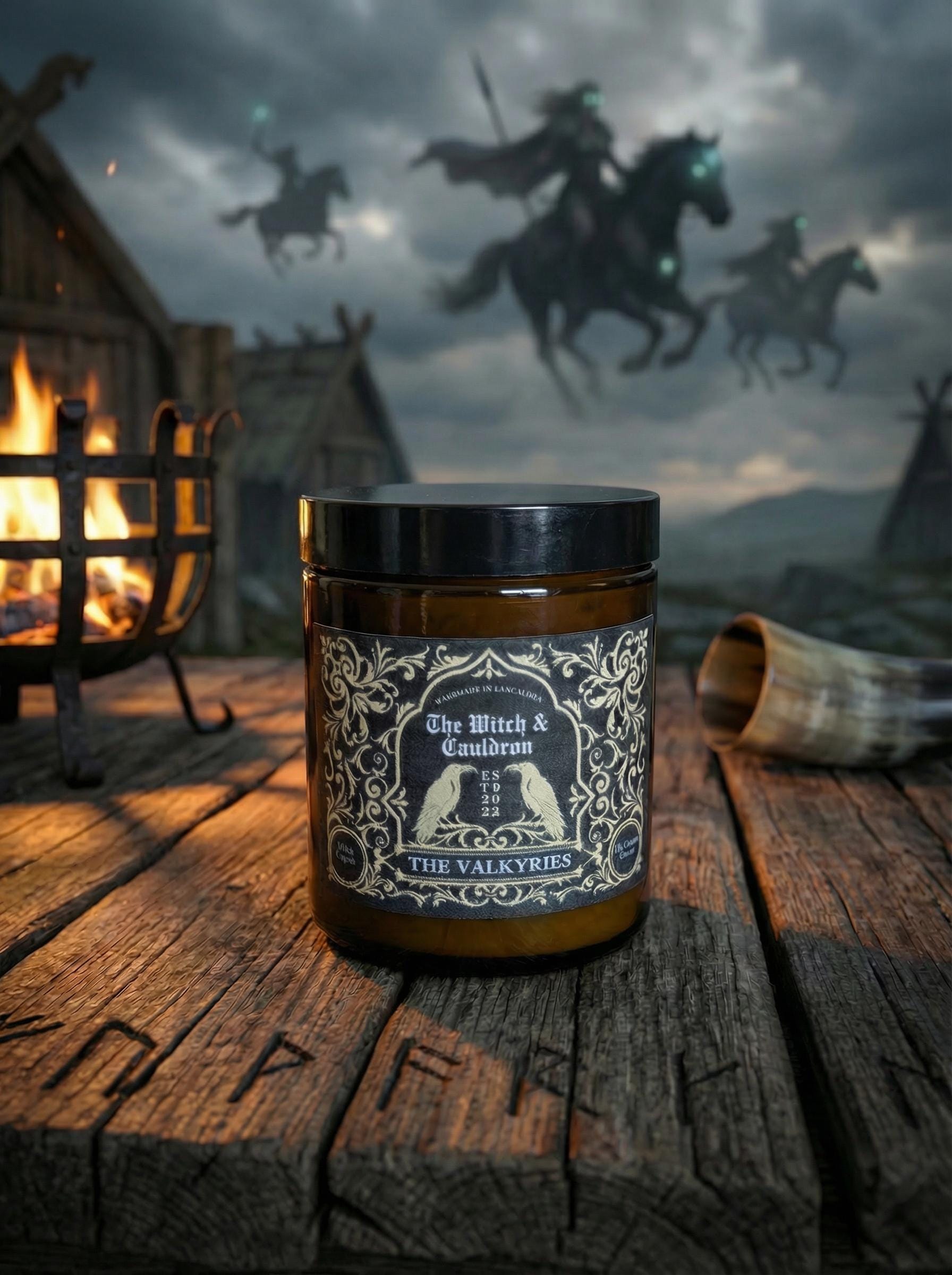 This Valkyries Soy Wax Candle has a blend of Black Spruce, Silver Fir. Birch, Frankincense, Myrrh and Rosewood essential oils that evoke the strength, coldness, and mythical nature of Valkyries