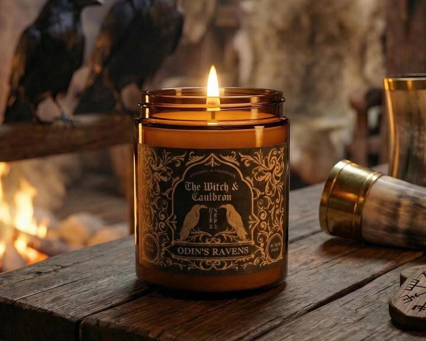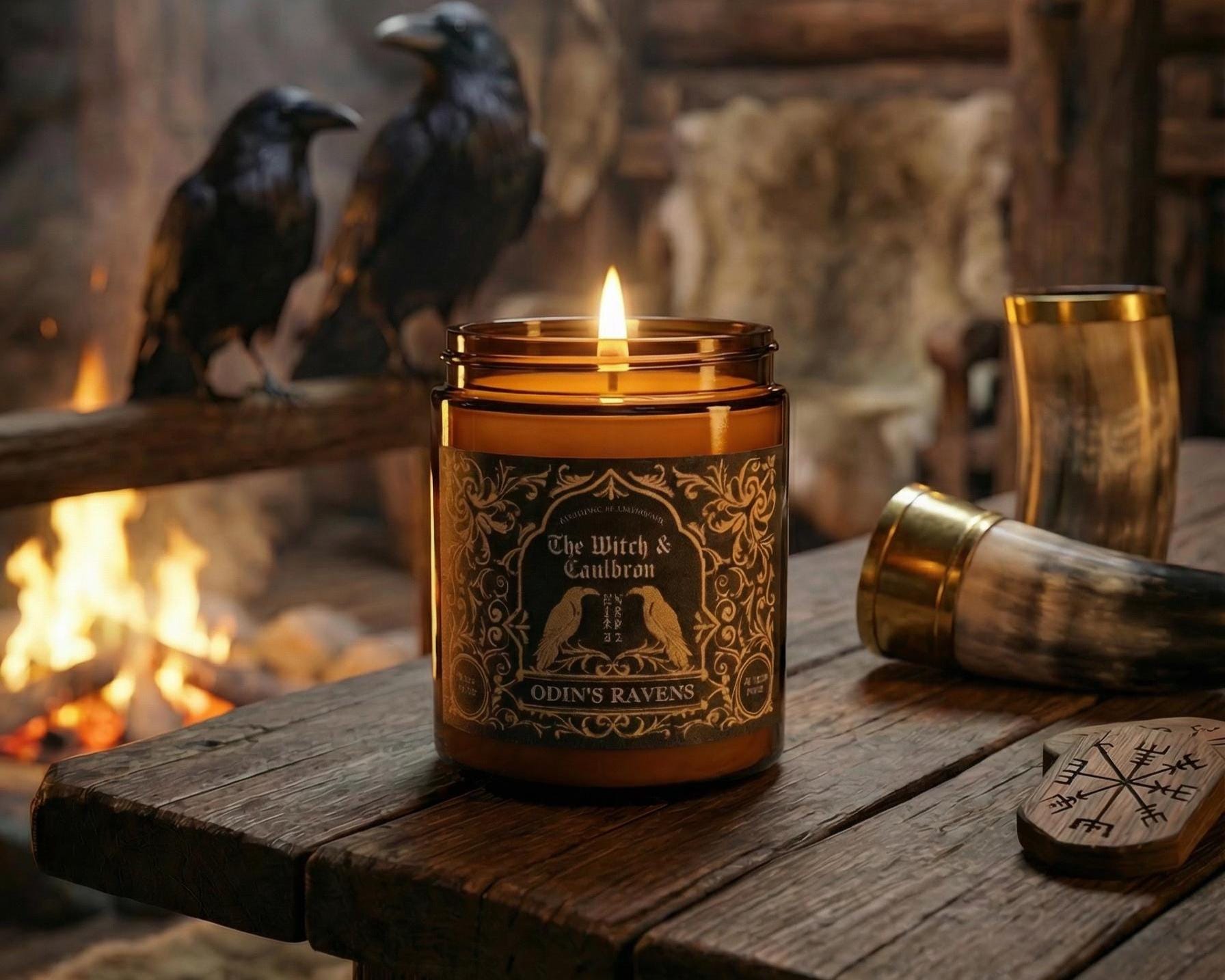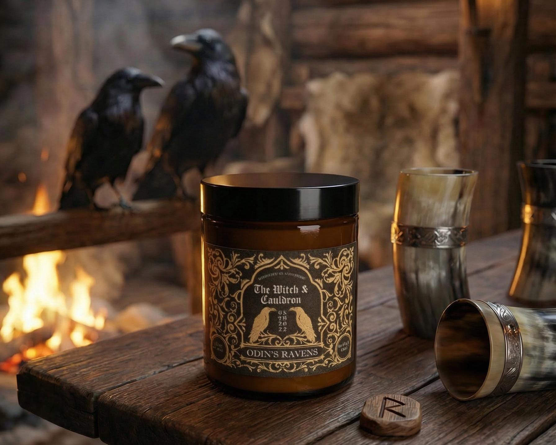 This Odin's Ravens Soy Wax Candle has a blend of Tea Tree, Peppermint, Camphor and Lemon essential oils to represent the All-father’s, pursuit of knowledge, intellect, and wisdom.
