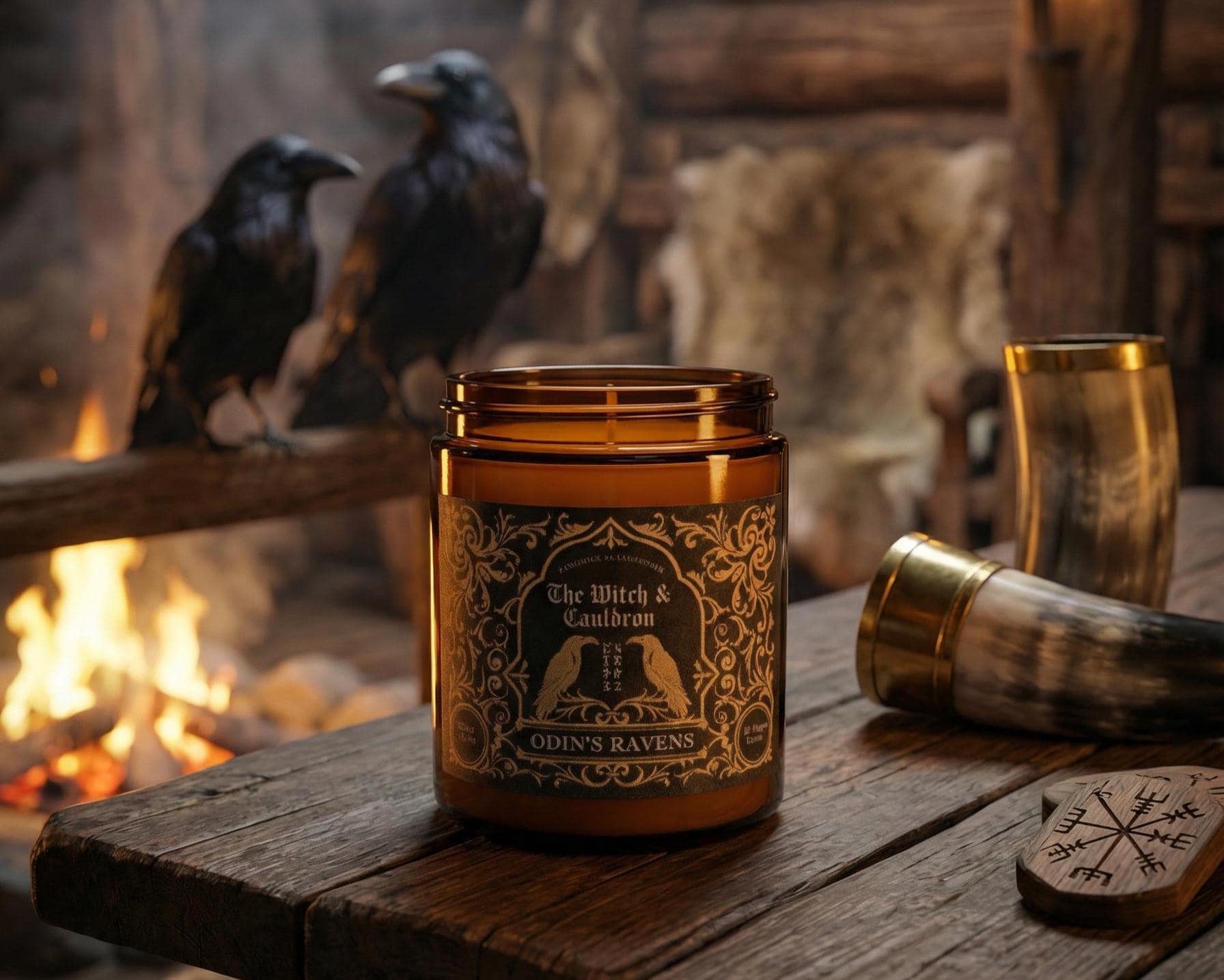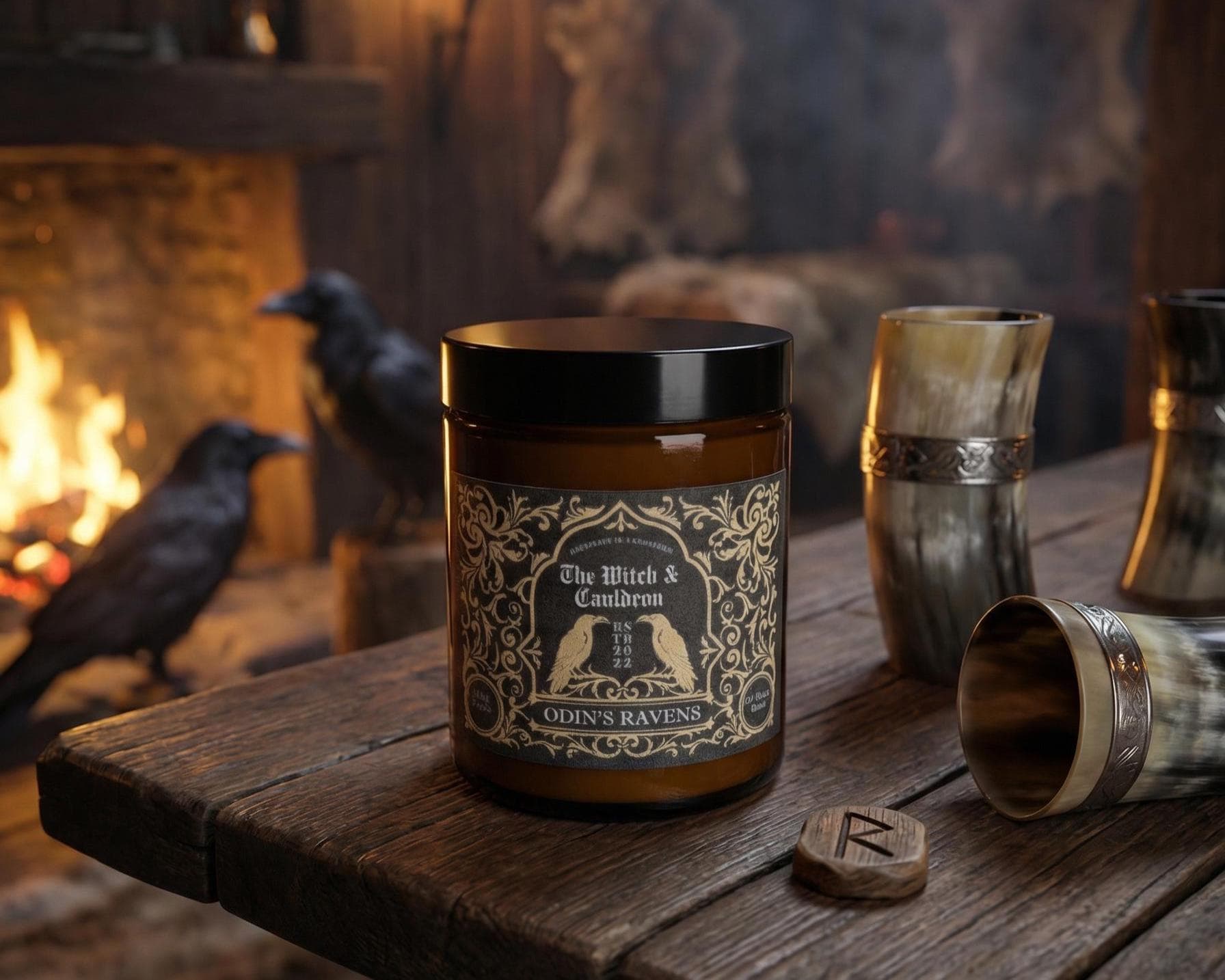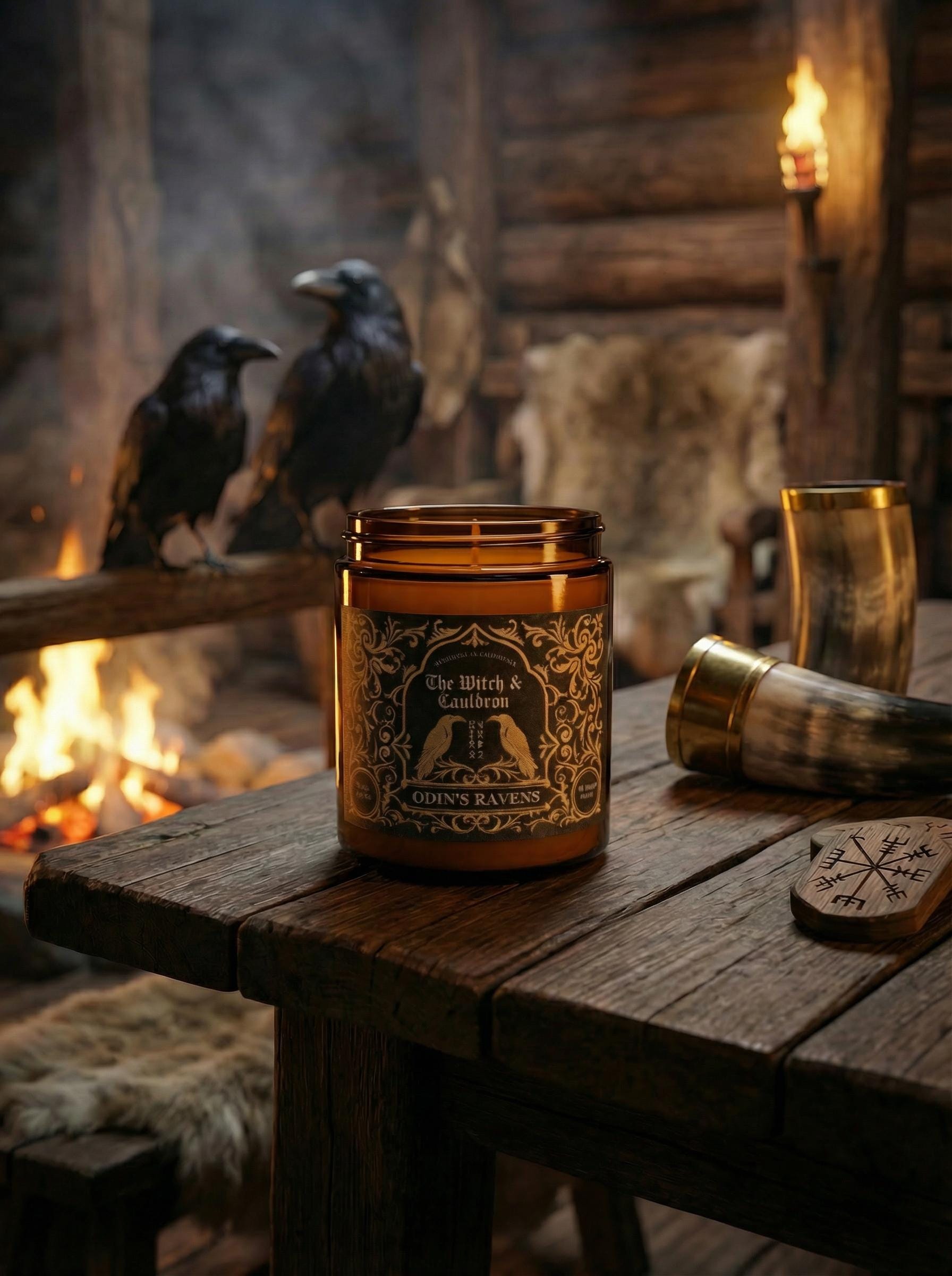 This Odin's Ravens Soy Wax Candle has a blend of Tea Tree, Peppermint, Camphor and Lemon essential oils to represent the All-father’s, pursuit of knowledge, intellect, and wisdom.